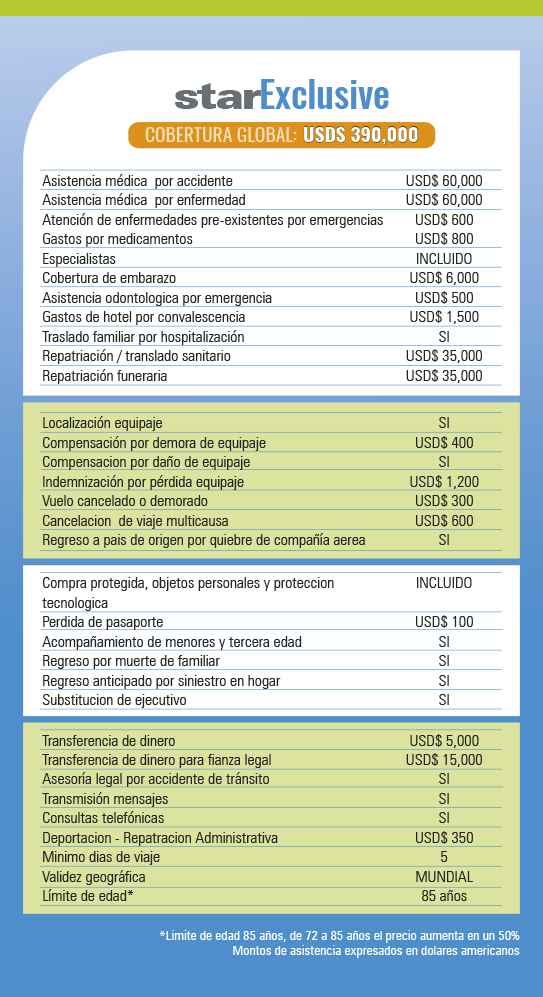 Con nuestro plan Star Exclusive, contarás con las mejores coberturas de asistencia al viajero durante tus viajes de negocio o vacaciones. Podrás atenderte en múltiples centros de salud, hospitales de emergencia y contar con nuestro soporte las 24hs del día, en cualquier parte del mundo. Es recomendable contar con un plan de asistencia para tus viajes ya que en caso de que te ocurra una emergencia tendrás a disposición un equipo de profesionales dispuesto a ayudarte y asesorarte paso a paso en cualquier emergencia.